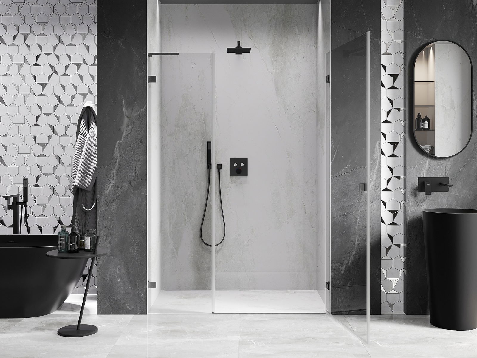 A handy and comfortable handle made from durable and resistant metal. Its trendy shape combined with a finish matched to the colour of the profiles gives the whole a modern and stylish look, highlighting the aesthetics of every bathroom.