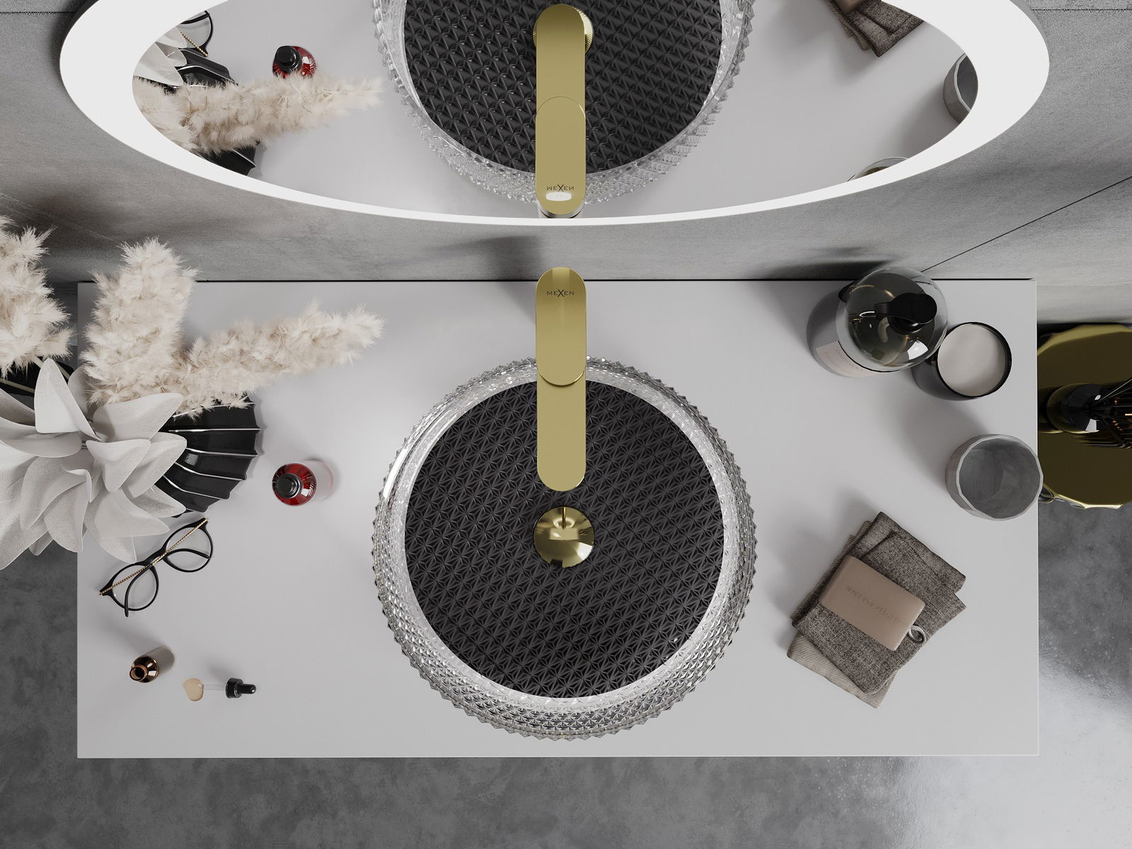 The washbasin features a unique crystal structure, giving it a distinctive and exceptionally striking appearance. The crystals shimmer in the light, catching the eye and adding elegance. A practical and stylish solution for any bathroom.