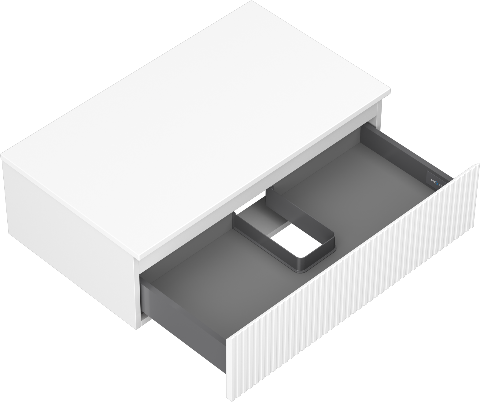 The cut-out in the drawer is designed to accommodate a siphon, which is essential for washbasin installations. This allows the furniture to be installed fully functionally, without having to sacrifice drawer space for the installation.