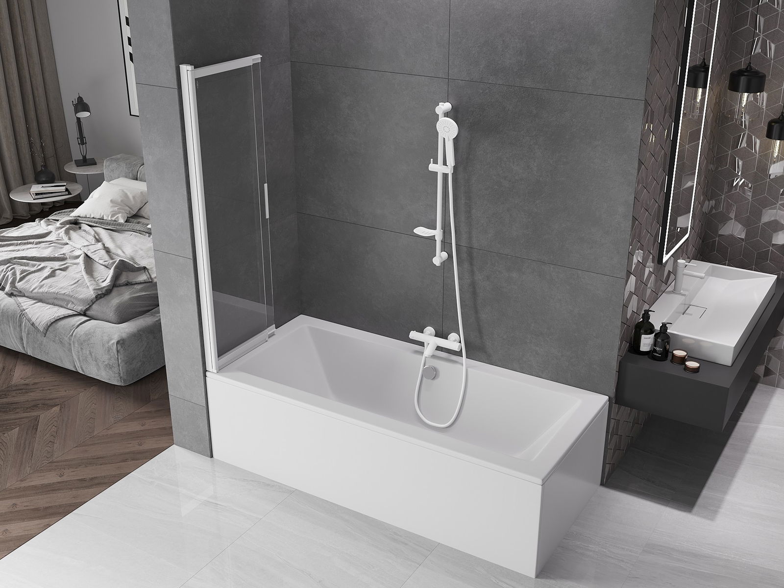 Effective protection against water spilling during bathing. The screen has seals that perfectly fit the glass surface and the edge of the bathtub. A functional solution ensuring safety and easy maintenance of cleanliness.