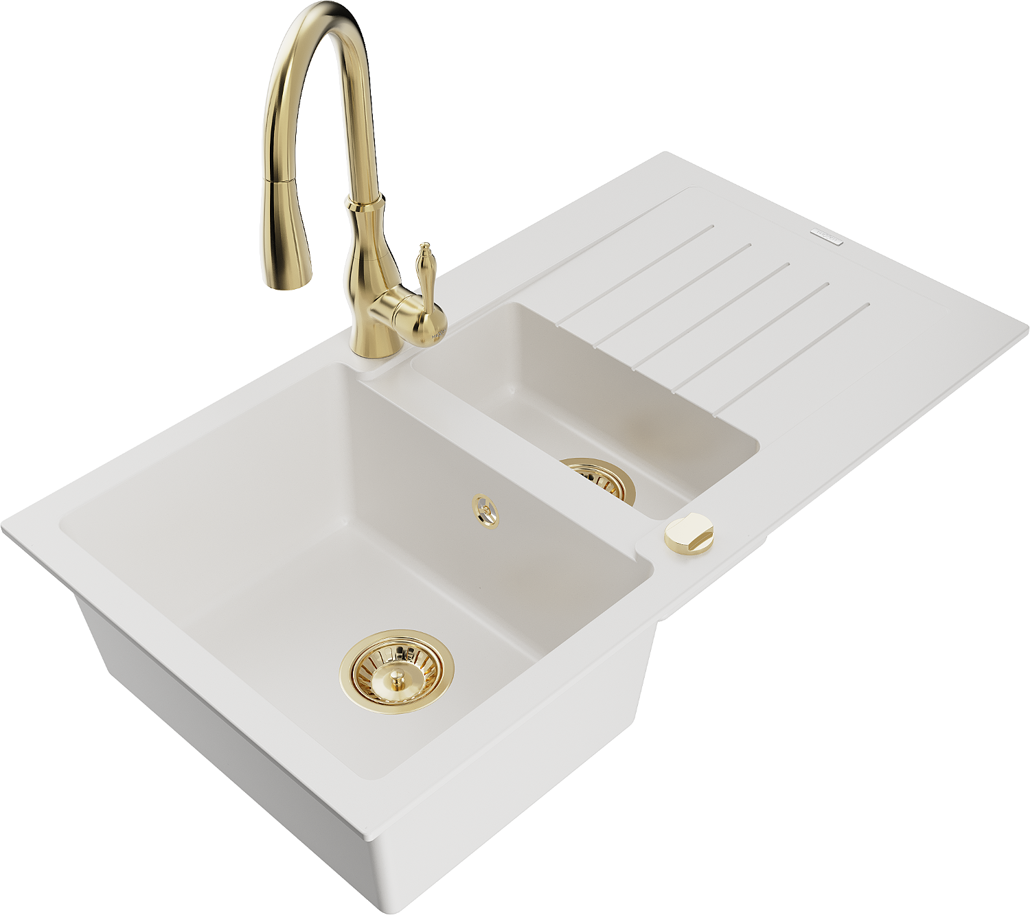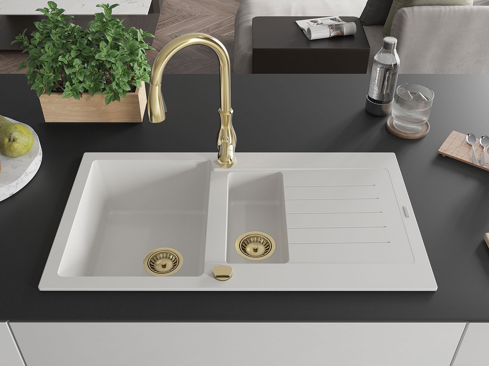 Mexen Matias granieten gootsteen 1,5-kamer met afdruiprek en keukenmengkraan Savita, wit - 6502-20-672601-50