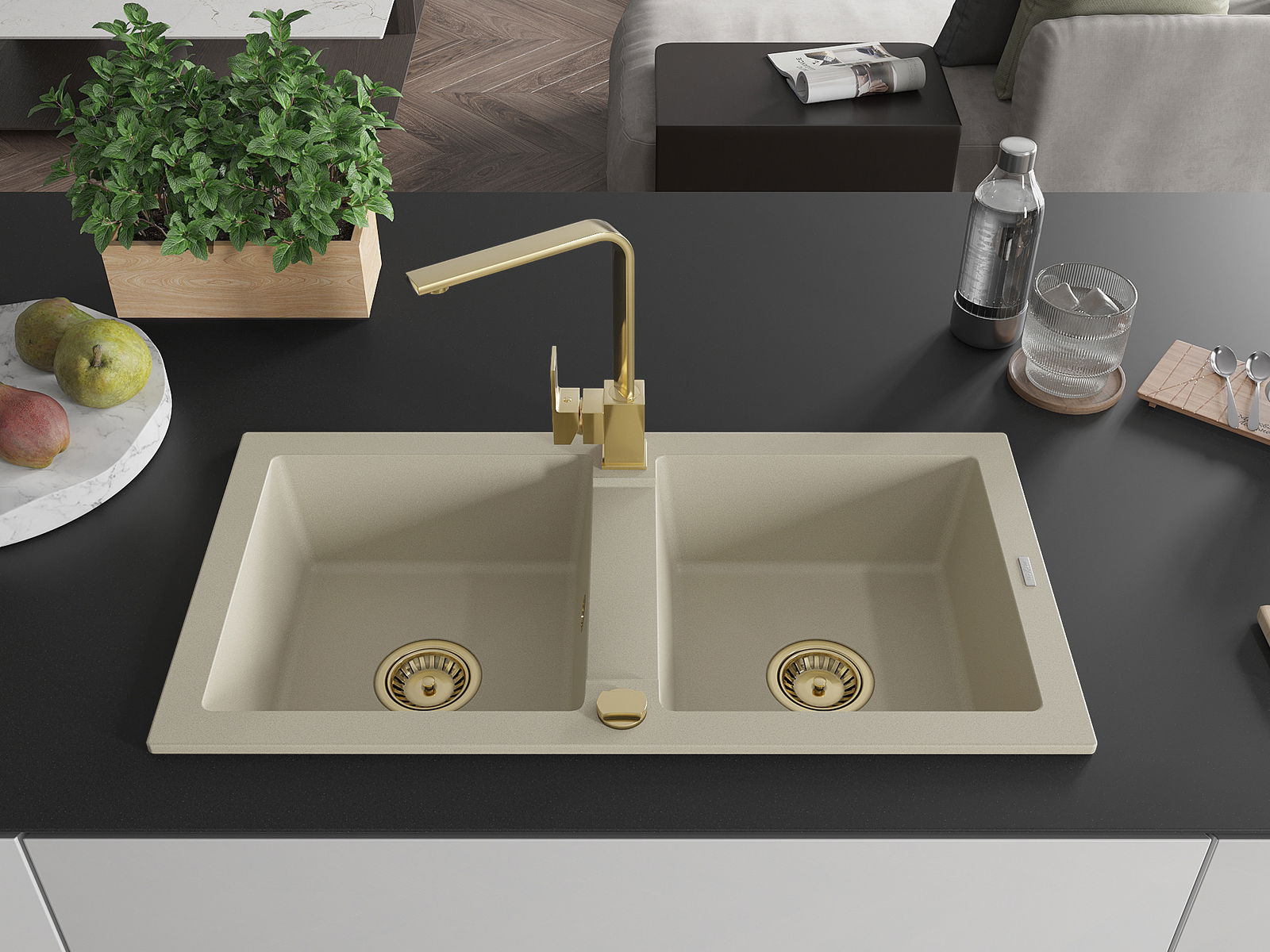 Mexen Mario granieten spoelbak met 2 kommen en keukenkraan Rita, beige - 6504-69-670300-50