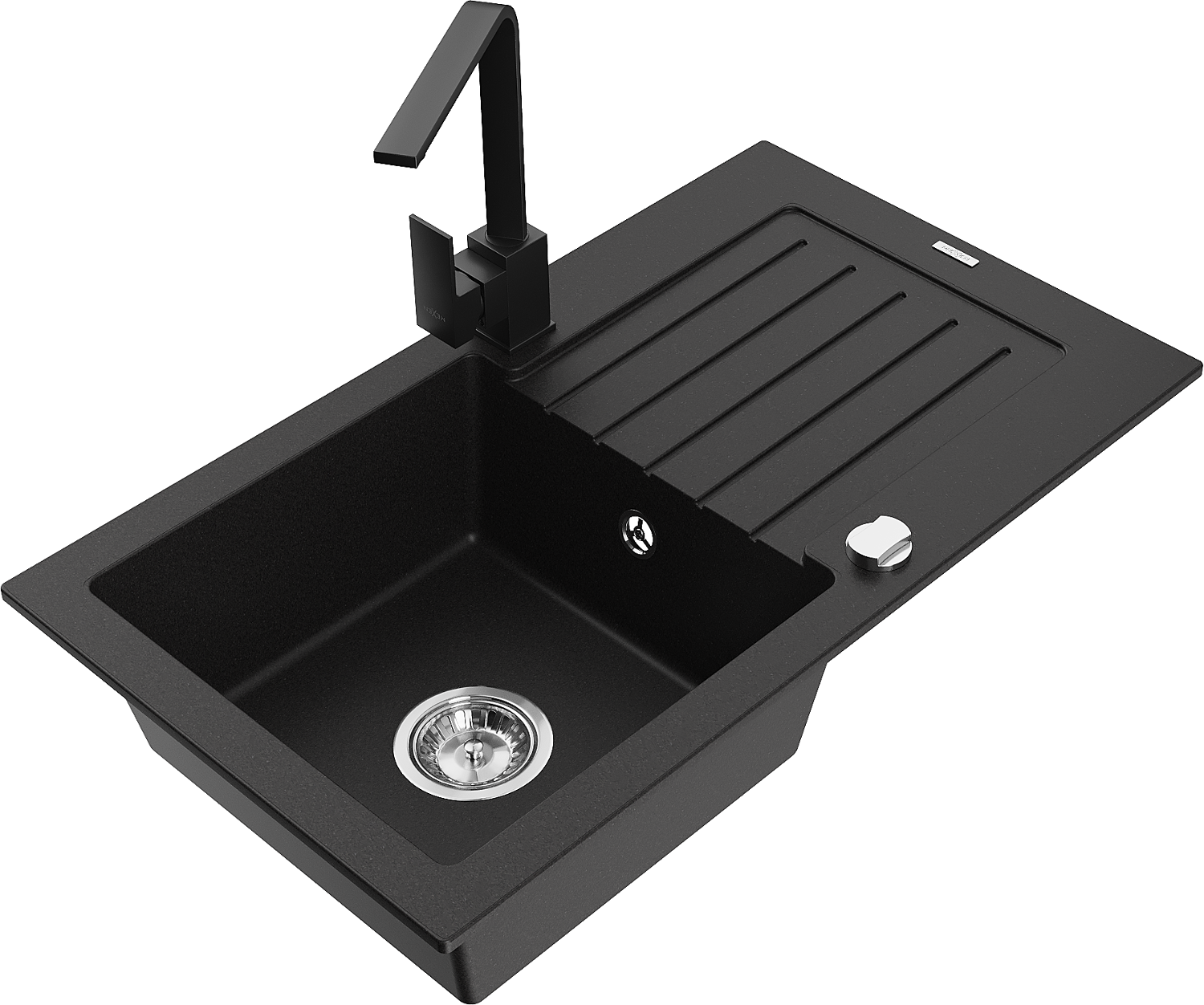 Mexen Pablo granieten gootsteen 1-kompartiment met afdruiprek en keukenmengkraan Rita, zwart - 6510-77-670300-70