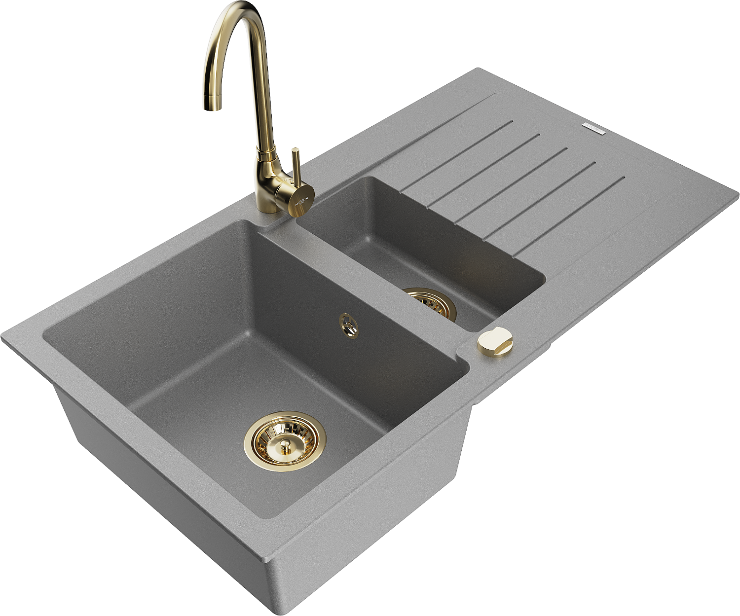 Mexen Matias granieten spoelbak 1,5-komor met afdruiprek en keukenkraan Telma, grijs - 6502-71-670200-50