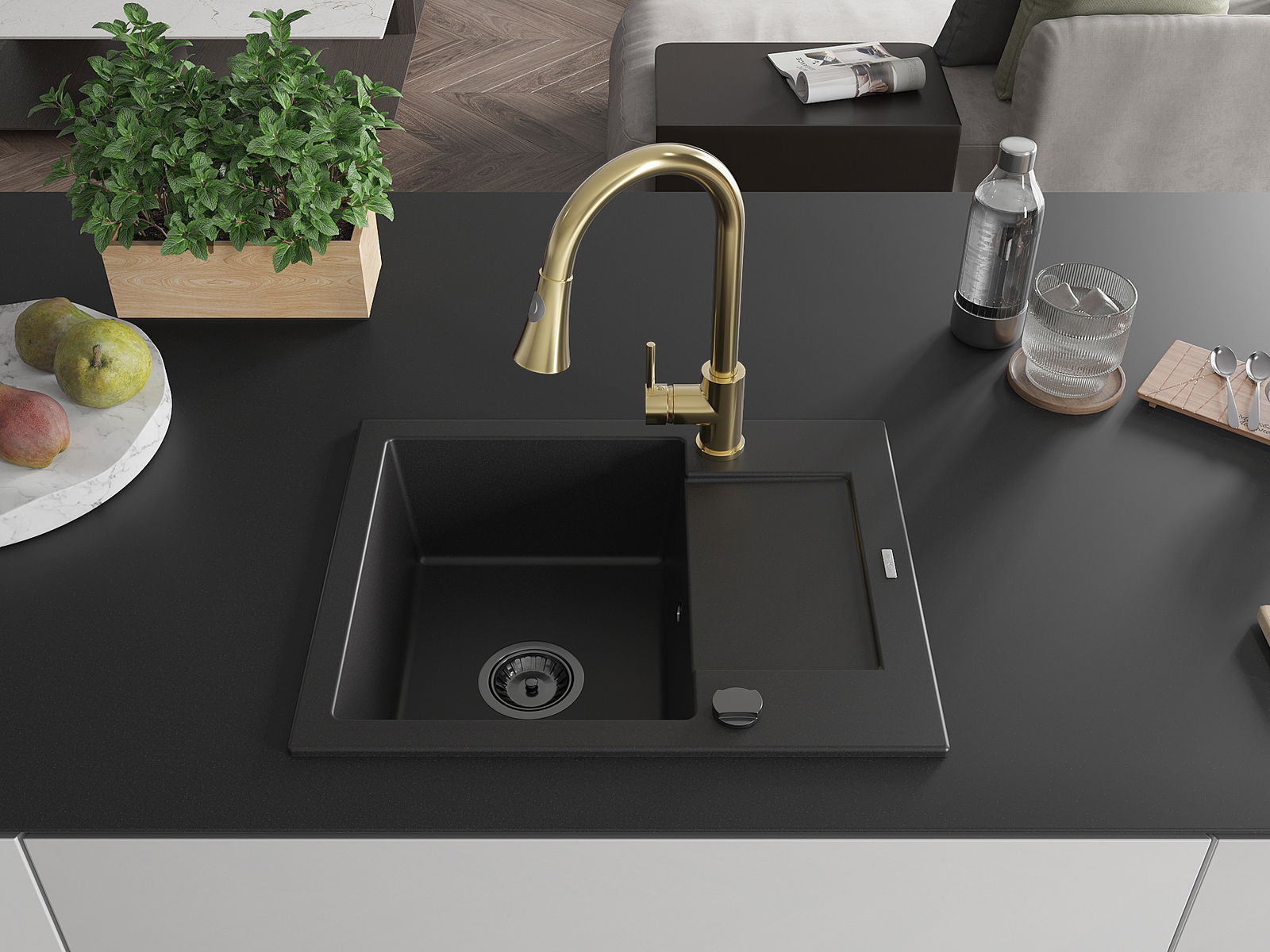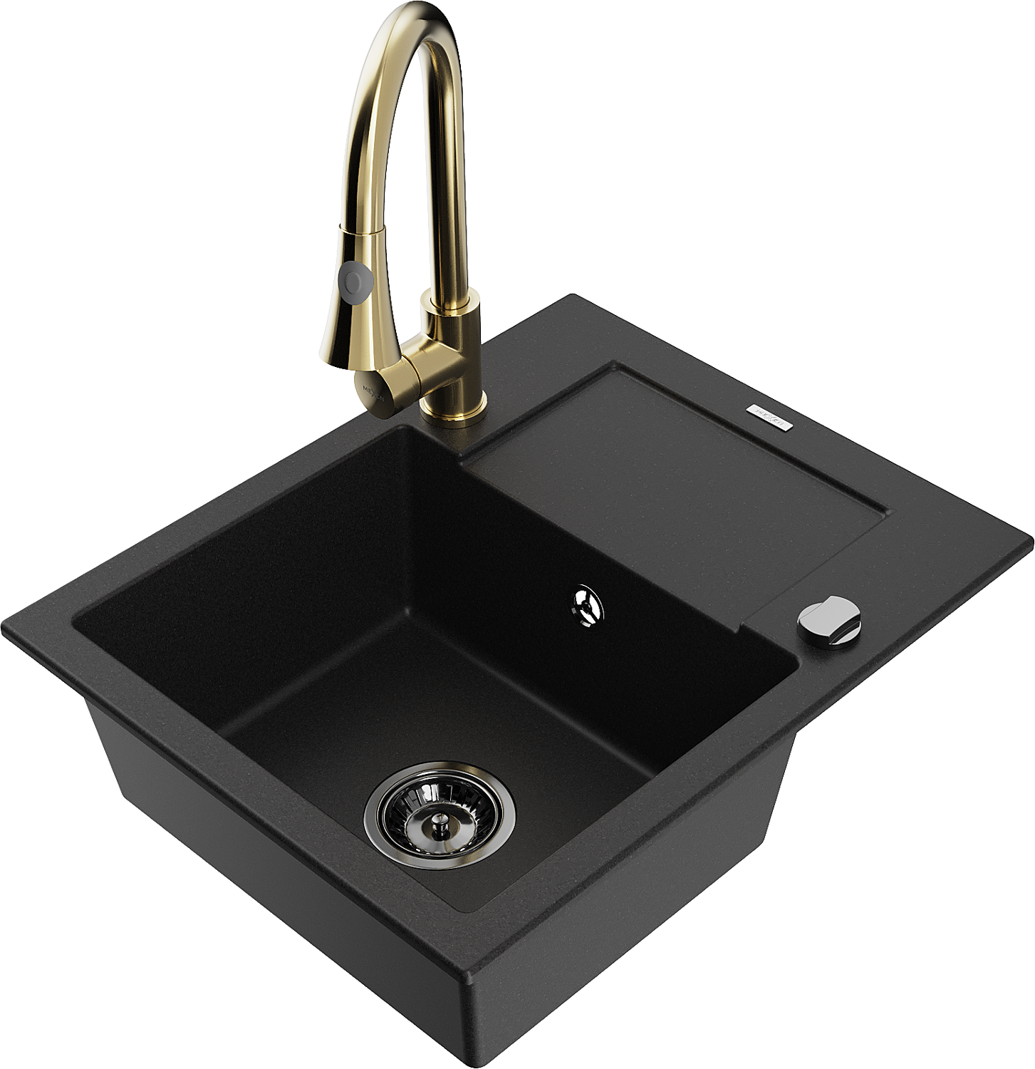Mexen Enzo granieten gootsteen met 1 bak en afdruiprek en keukenmengkraan Elia, zwart - 6506-77-670101-50-B