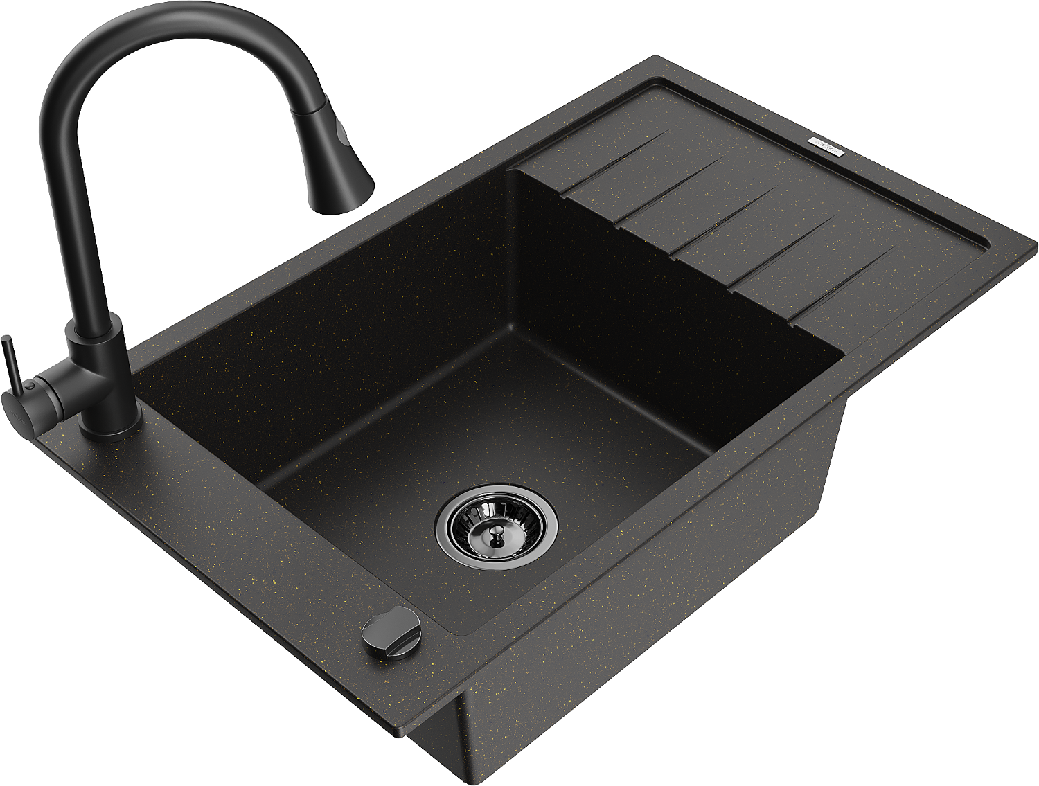 Mexen Elias granieten spoelbak met 1 bak, afdruipplaat en keukenmengkraan Elia, zwart/goud metallic - 6511-75-670101-70-B