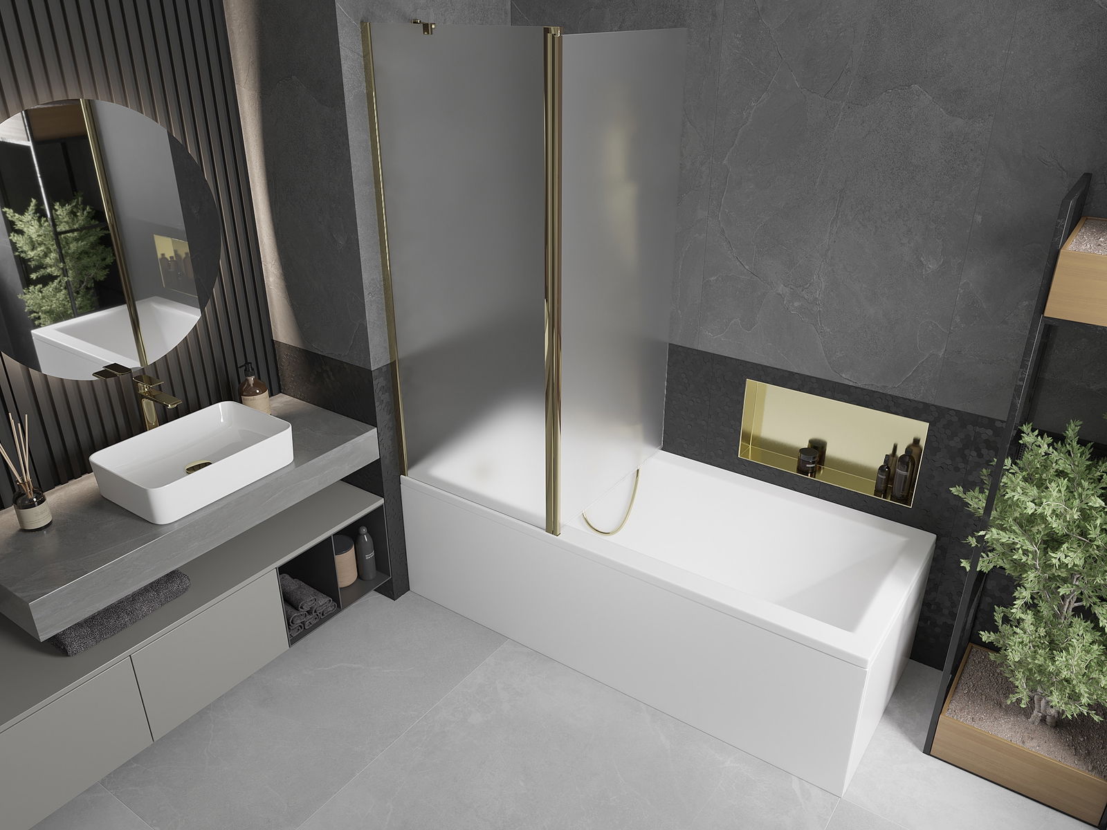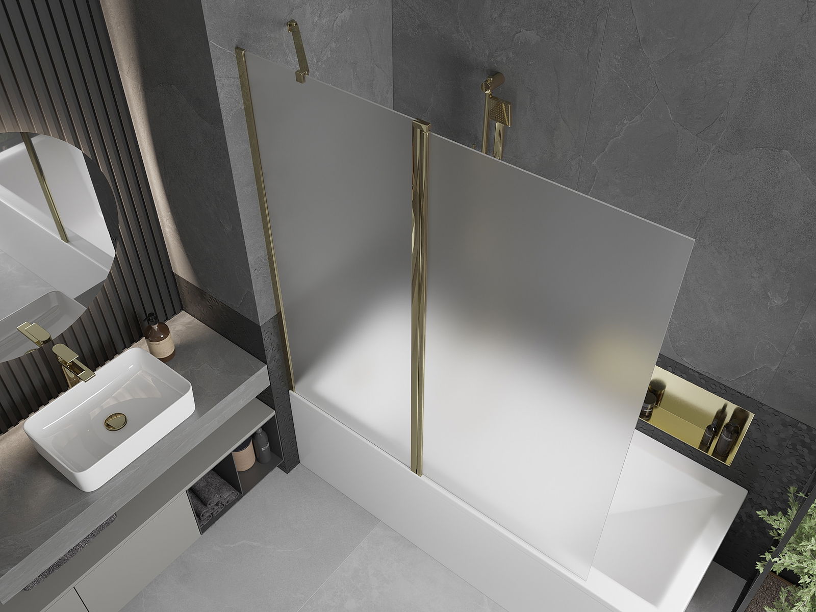 Het scherm heeft één beweegbare vleugel die kan worden opgevouwen. Deze oplossing bespaart ruimte in de badkamer en zorgt ervoor dat u de resterende ruimte vrij kunt gebruiken wanneer de badkamer niet in gebruik is.