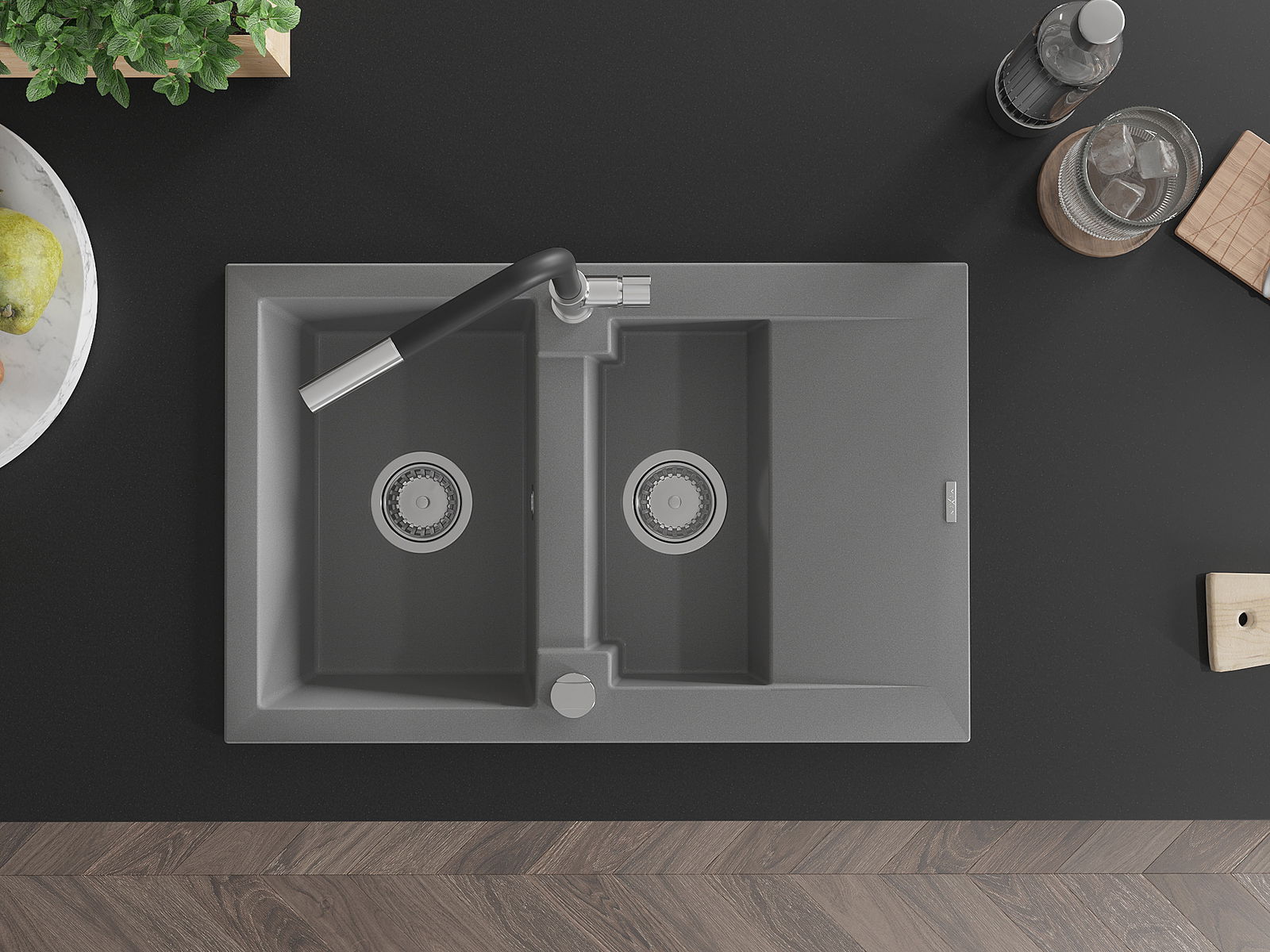Mexen Gaspar granieten spoelbak met 1,5 bak en afdruiprek en keukenmengkraan Flora, grijs - 6507-71-670401-07