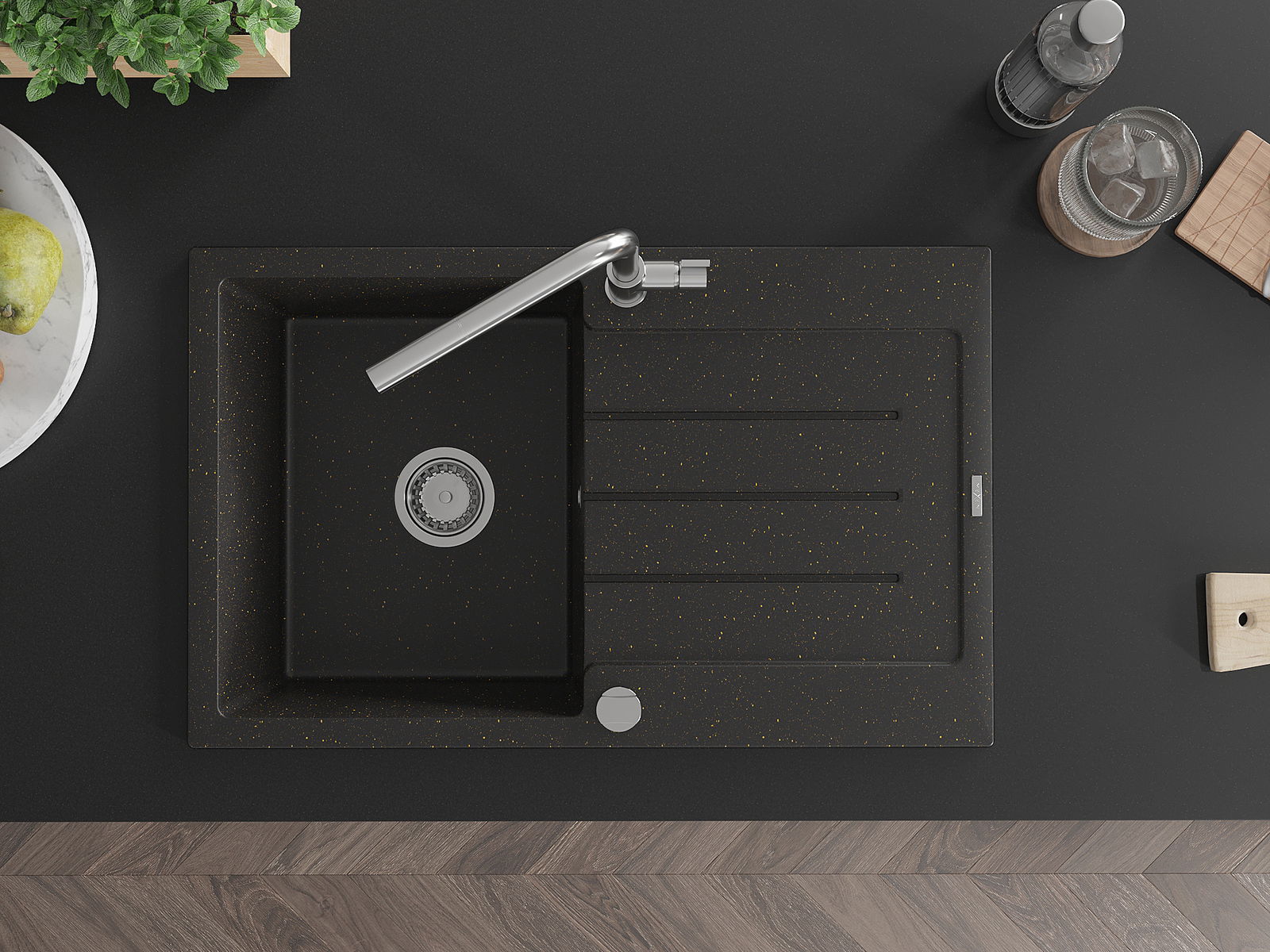 Mexen Bruno granieten spoelbak met 1 bak en afdruiprek en keukenkraan Flora, zwart/goud metallic - 6513-75-670401-00