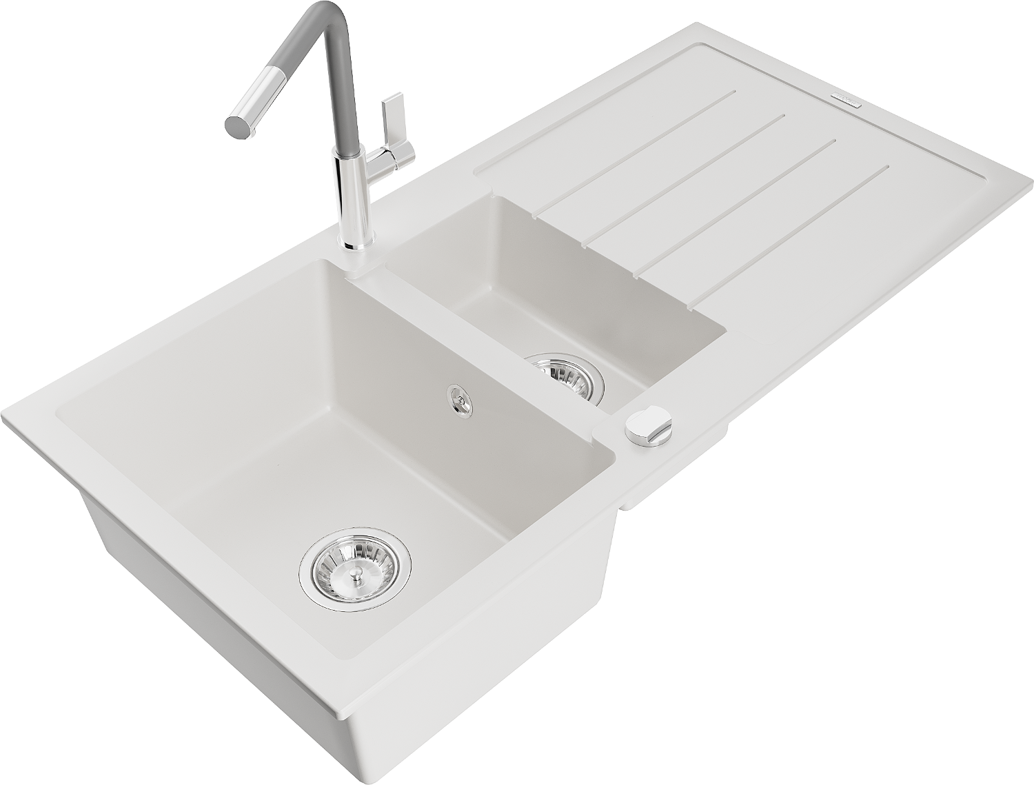 Mexen Andres granieten spoelbak 1,5-komor met afdruiprek en keukenkraan Flora, wit - 6515-20-670401-06