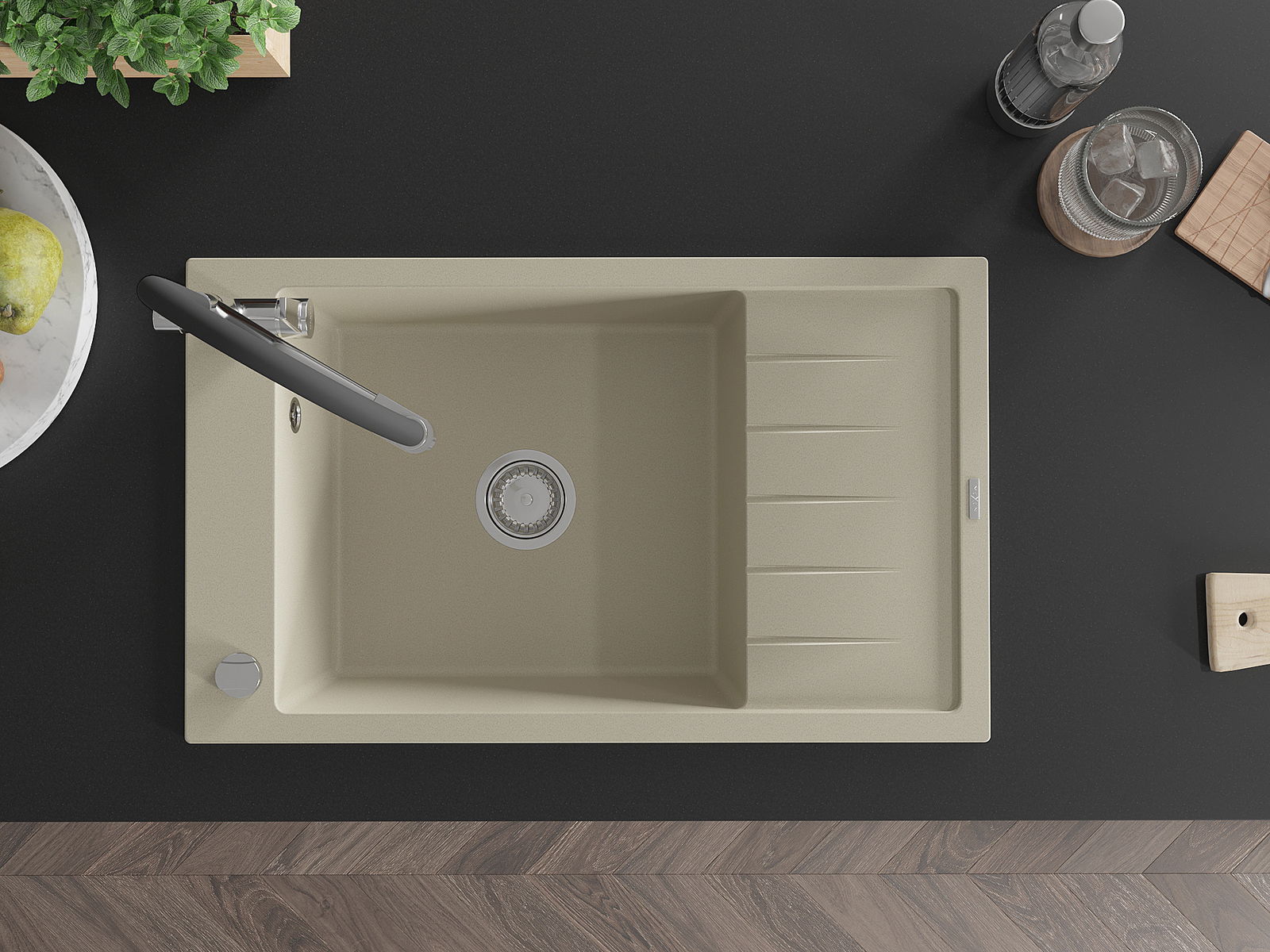 De gootsteen is gemaakt van hoogwaardig graniet. Het vormt een elegante en vooral praktische aanvulling op elke keuken, ongeacht de stijl ervan. De hoge kwaliteit en duurzaamheid van graniet garanderen jarenlang gebruik.