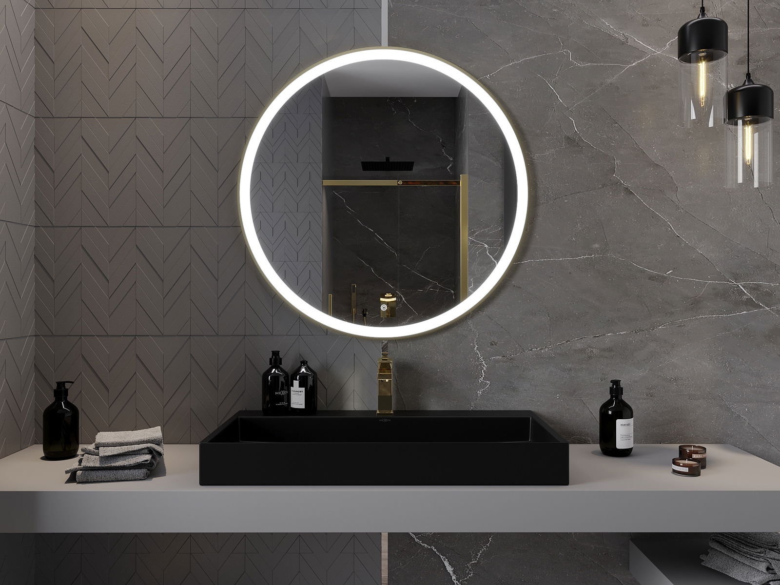 Mexen Esso ronde, verlichte badkamer spiegel, 90 cm, LED 6000K, antivorming, gouden frame - 9825-090-090-611-50