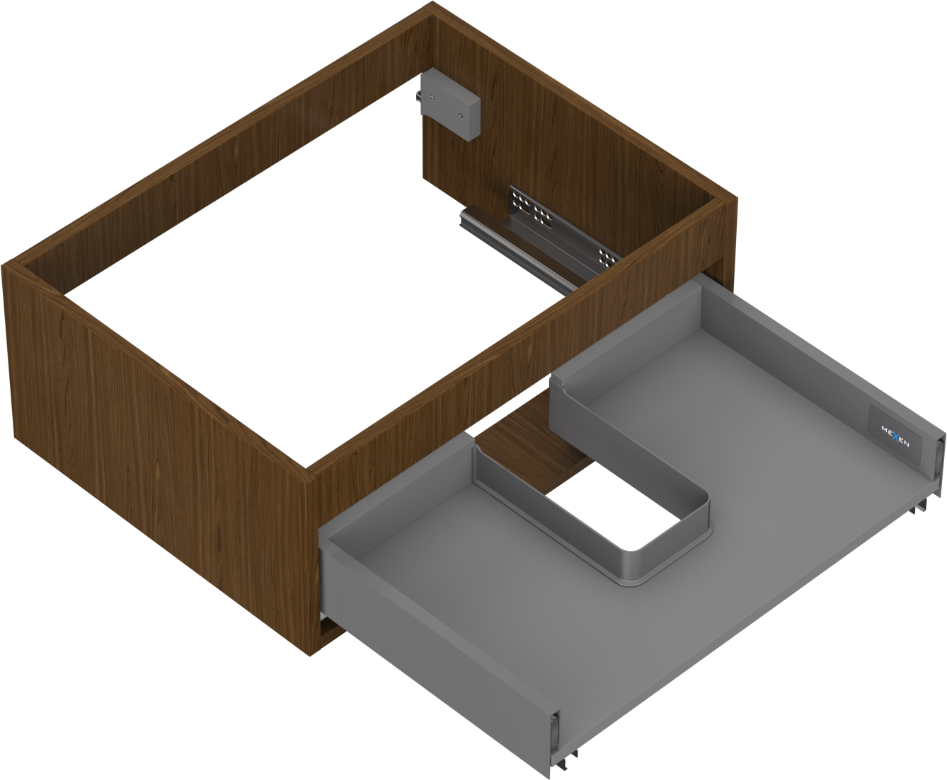 De uitsparing in de lade is ontworpen voor de sifon, die essentieel is bij het installeren van wastafels. Hierdoor kan de unit volledig functioneel worden geïnstalleerd zonder dat er laderuimte hoeft te worden opgeofferd.