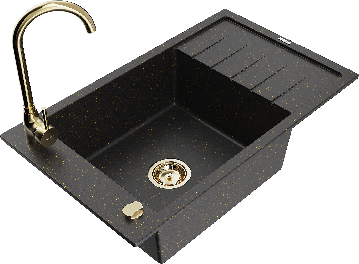 Mexen Elias granieten spoelbak 1-komps met afdruiprek en keukenkraan Telma, zwart/goud - 6511-75-670200-50